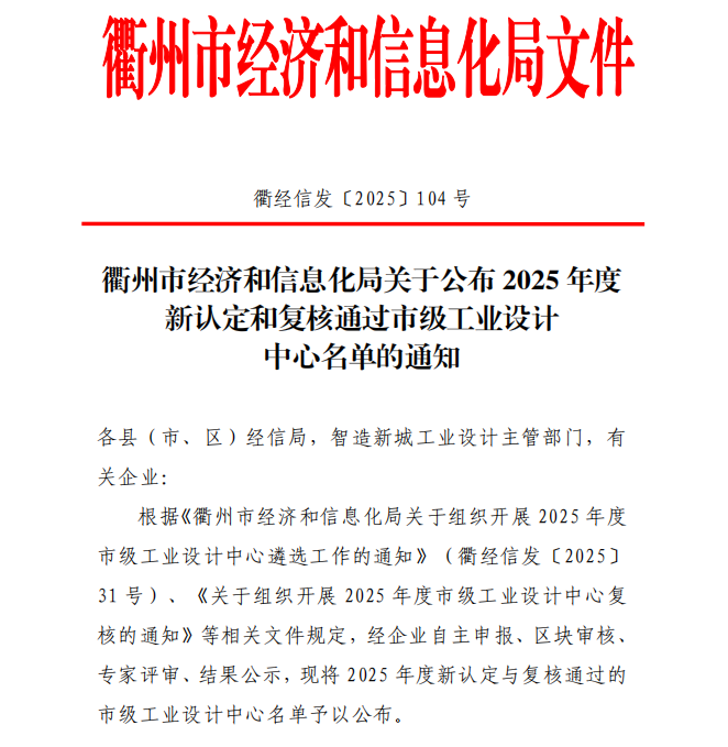 近日,衢州市經濟和信息化局公布了2025年度新認定和復核通過市級工業設計中心的名單,根據《衢州市經濟和信息化局關于組織開展2025年度市級工業設計中心遴選工作的通知》《關于組織開展2025年度市級工業設計中心復核的通知》等相關文件規定,經企業自主申報、區塊審核、專家評審等一系列流程,浙江海納半導體股份有限公司(以下簡稱“海納股份”)成功通過衢州市2025年度市級工業設計中心復核。